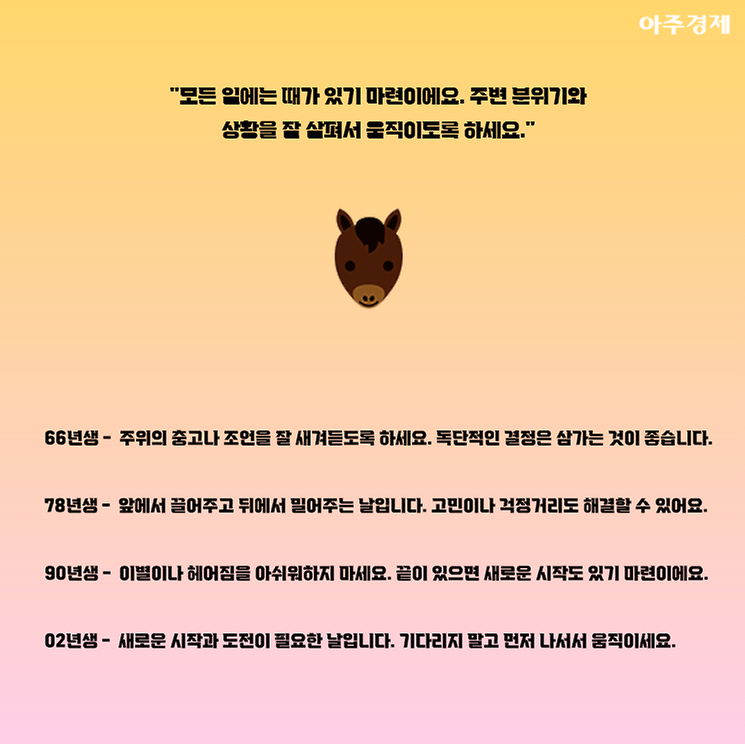 ▶말띠 오늘의 운세 "모든 일에는 때가 있기 마련이에요. 주변 분위기와 상황을 잘 살펴서 움직이도록 하세요."