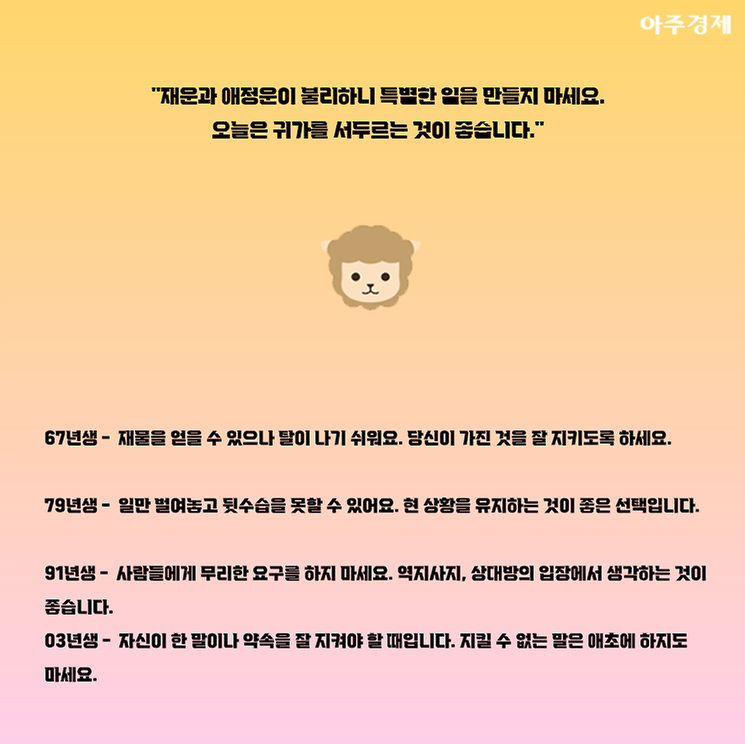 ▶양띠 오늘의 운세 "재운과 애정운이 불리하니 특별한 일을 만들지 마세요. 오늘은 귀가를 서두르는 것이 좋습니다."