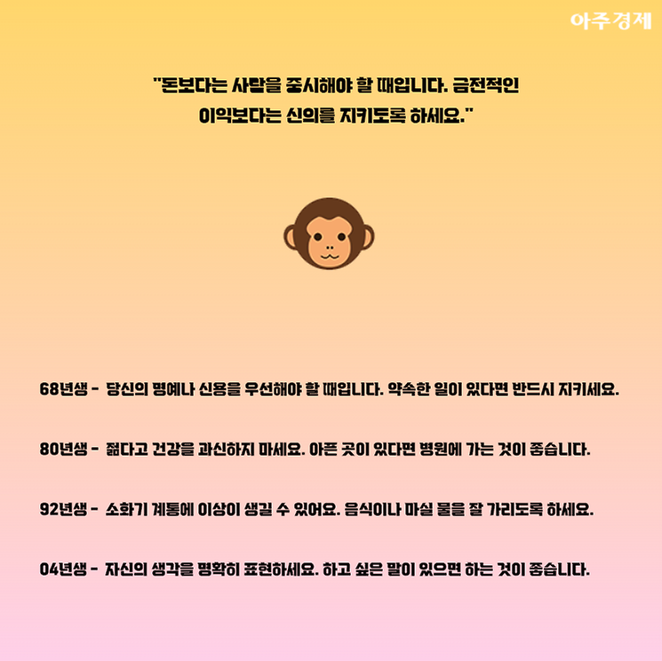 ▶원숭이띠 오늘의 운세 "돈보다는 사람을 중시해야 할 때입니다. 금전적인 이익보다는 신의를 지키도록 하세요."