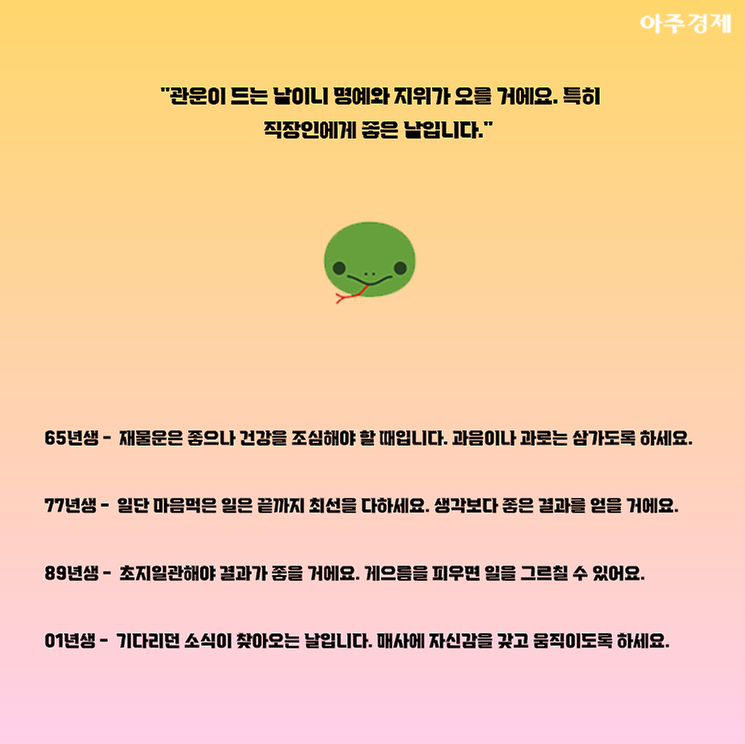 ▶뱀띠 오늘의 운세 "관운이 드는 날이니 명예와 지위가 오를 거에요. 특히 직장인에게 좋은 날입니다."