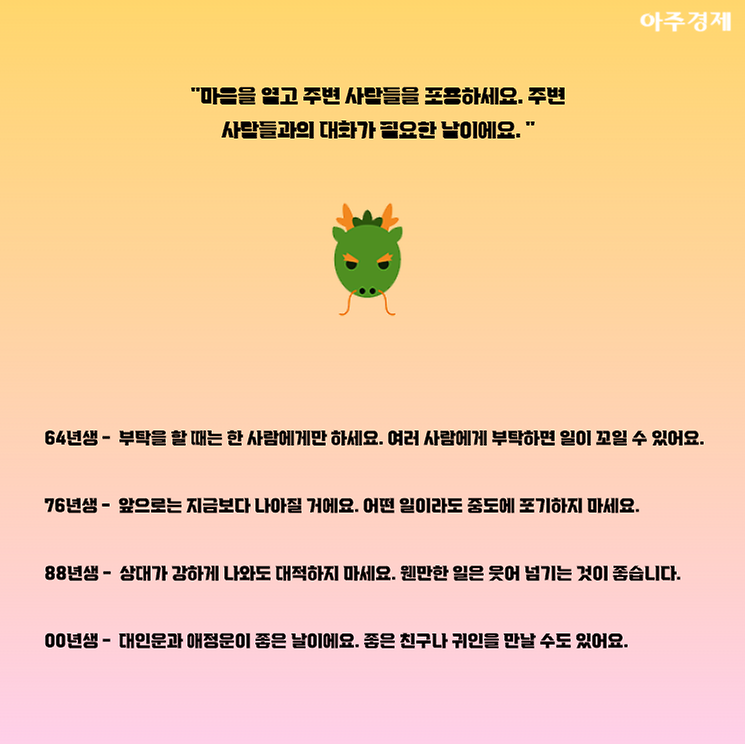 ▶용띠 오늘의 운세 "마음을 열고 주변 사람들을 포용하세요. 주변 사람들과의 대화가 필요한 날이에요. "