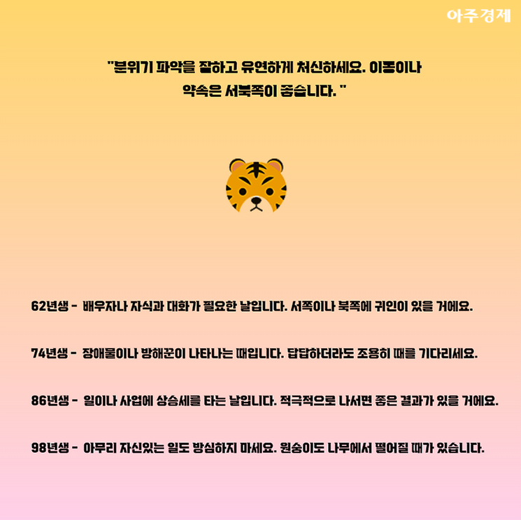 ▶호랑이띠 오늘의 운세 "분위기 파악을 잘하고 유연하게 처신하세요. 이동이나 약속은 서북쪽이 좋습니다. "