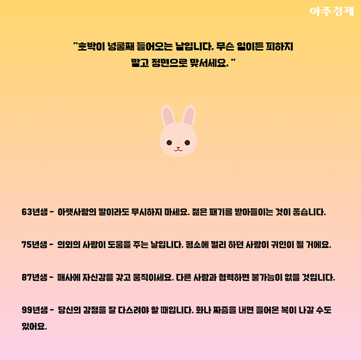 ▶토끼띠 오늘의 운세 "호박이 넝쿨째 들어오는 날입니다. 무슨 일이든 피하지 말고 정면으로 맞서세요. "