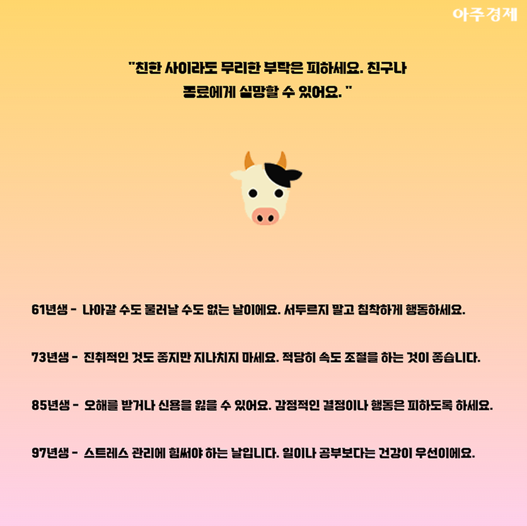 ▶소띠 오늘의 운세 "친한 사이라도 무리한 부탁은 피하세요. 친구나 동료에게 실망할 수 있어요. "