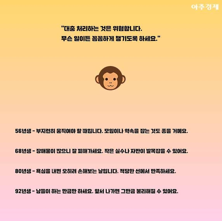 ▶원숭이띠 오늘의 운세 "대충 처리하는 것은 위험합니다. 무슨 일이든 꼼꼼하게 챙기도록 하세요."