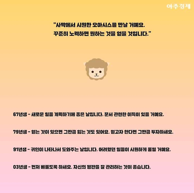 ▶양띠 오늘의 운세 "사막에서 시원한 오아시스를 만날 거에요. 꾸준히 노력하면 원하는 것을 얻을 것입니다."