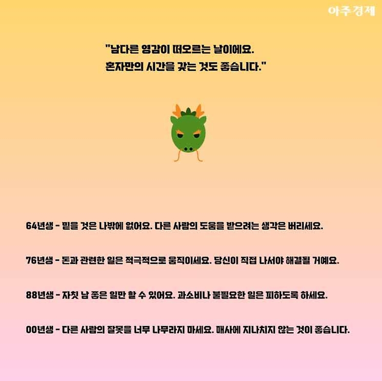 ▶용띠 오늘의 운세 "백 마디 말보다는 한 가지 행동이 필요한 날입니다. 다만 버릴 것은 버리도록 하세요. "