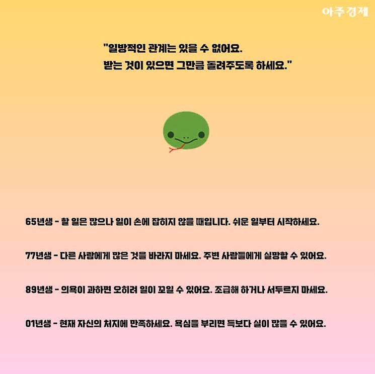 ▶뱀띠 오늘의 운세 "백 마디 말보다는 한 가지 행동이 필요한 날입니다. 다만 버릴 것은 버리도록 하세요. "