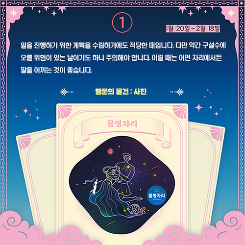 1. [별자리별 오늘의 운세] 물병자리 (1월 20일∼2월 18일)일을 진행하기 위한 계획을 수립하기에도 적당한 때입니다. 다만 약간 구설수에 오를 위험이 있는 날이기도 하니 주의해야 합니다. 이럴 때는 어떤 자리에서든 말을 아끼는 것이 좋습니다.