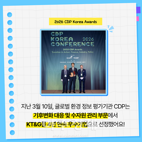 KT&G, 'CDP' 기후변화·수자원 관리 부문 우수기업 선정 [사진=KT&G] 관련기사KT&G '에쎄', 해외 연 매출 최초 1조원 돌파KT&G·코스맥스바이오·CJ온스타일·W컨셉·쿠팡 #우수기업 #카드뉴스 #KT&G 좋아요0 나빠요0 김현아 기자haha@ajunews.com 이선주 LG생활건강 사장 "2026년 성장 전환의 해 만들겠다" [식품·외식 뉴스픽] 동원그룹·BBQ·롯데웰푸드·오뚜기·롯데리아 기자의 다른기사 ©'5개국어 글로벌 경제신문' 아주경제. 무단전재·재배포 금지 댓글0 0 / 300 등록 더보기 추천 기사 시한 지났는데 전공의 복귀 '미미한 수준'...271명 추가돼 누적 565명 [르포] '중력 6배'에 짓눌려 기절 직전…전투기 조종사 비행환경 적응훈련(영상) 한동훈 "함께 정치하고 싶다"…김영주 "늦지 않게 답할 것" 4일 동교동계 국회 발표…민주당 '공천 파동' 내홍 격화 尹 "3·1운동은 모두가 풍요 누리는 통일로 완결... 한일, 세계 평화·번영 파트너" 의협 "의사들 자유 시민 자격 인정받지 못해"…압수수색에 분노