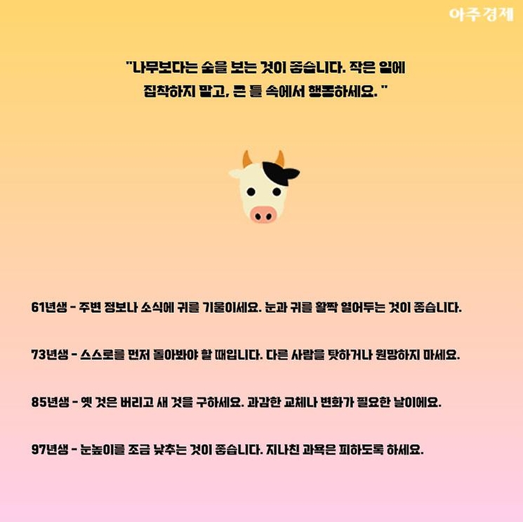 ▶소띠 오늘의 운세 "나무보다는 숲을 보는 것이 좋습니다. 작은 일에 집착하지 말고, 큰 틀 속에서 행동하세요."