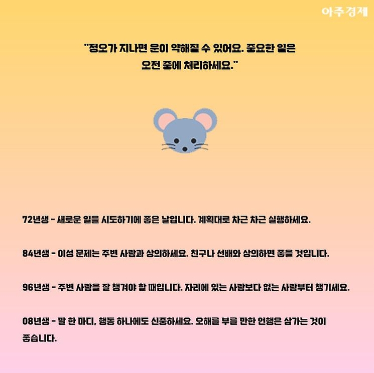 ▶쥐띠 오늘의 운세 "정오가 지나면 운이 약해질 수 있어요. 중요한 일은 오전 중에 처리하세요."