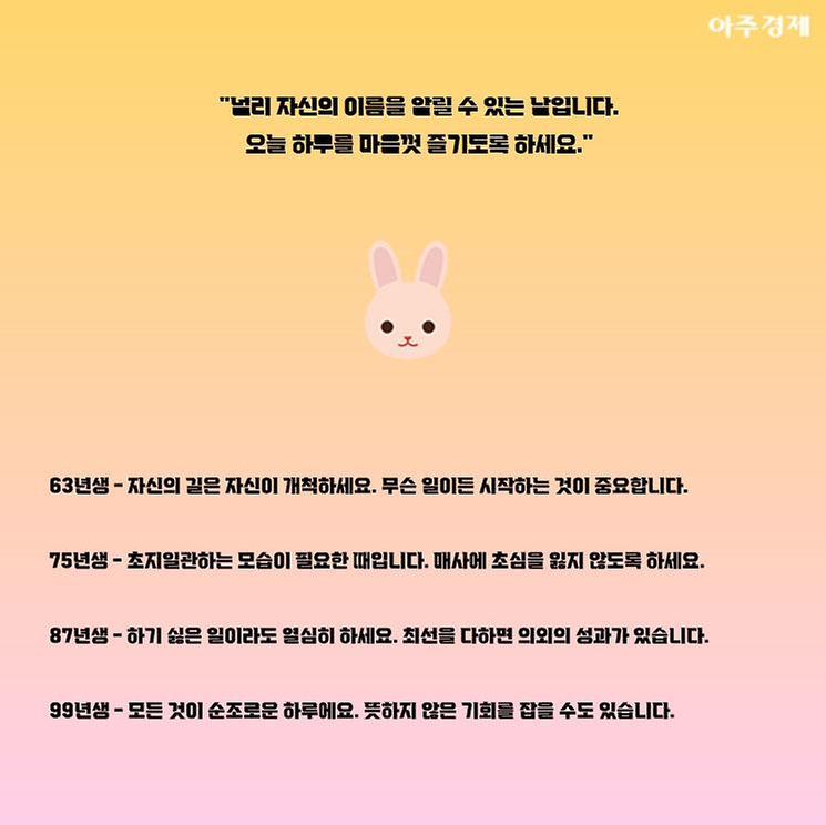 ▶토끼띠 오늘의 운세 "널리 자신의 이름을 알릴 수 있는 날입니다. 오늘 하루를 마음껏 즐기도록 하세요."