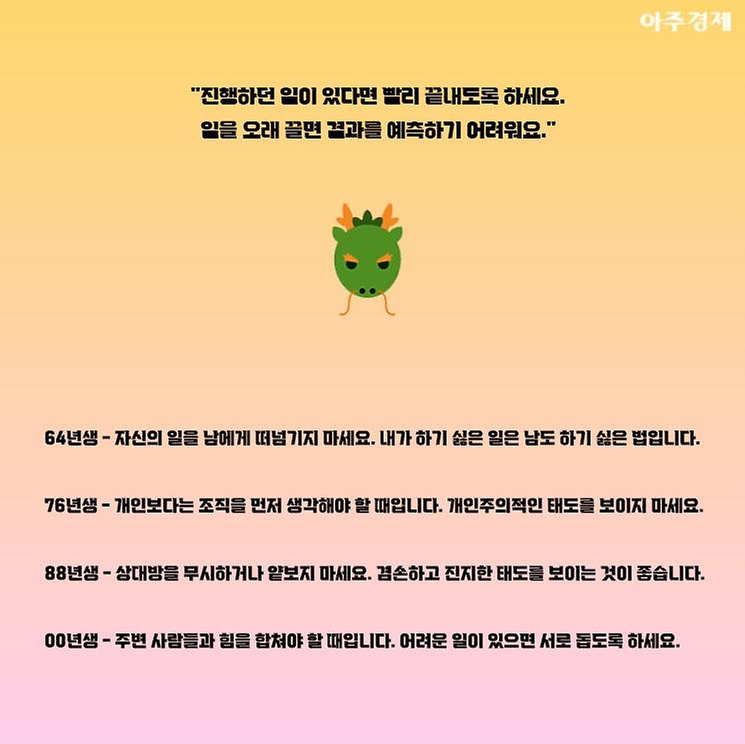 ▶용띠 오늘의 운세 "진행하던 일이 있다면 빨리 끝내도록 하세요. 일을 오래 끌면 결과를 예측하기 어려워요."