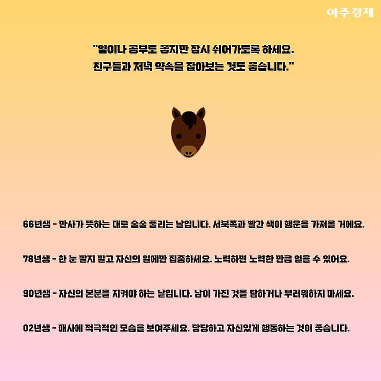 ▶말띠 오늘의 운세 "일이나 공부도 좋지만 잠시 쉬어가도록 하세요. 친구들과 저녁 약속을 잡아보는 것도 좋습니다."