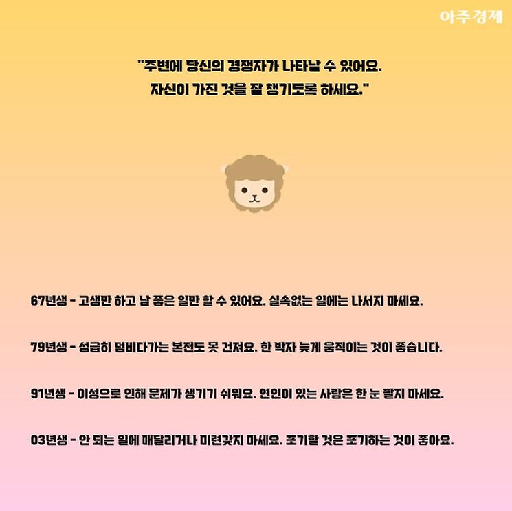 ▶양띠 오늘의 운세 "주변에 당신의 경쟁자가 나타날 수 있어요. 자신이 가진 것을 잘 챙기도록 하세요."