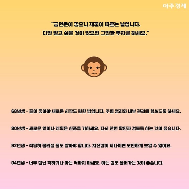 ▶원숭이띠 오늘의 운세 "금전운이 좋으니 재물이 따르는 날입니다. 다만 얻고 싶은 것이 있으면 그만한 투자를 하세요."
