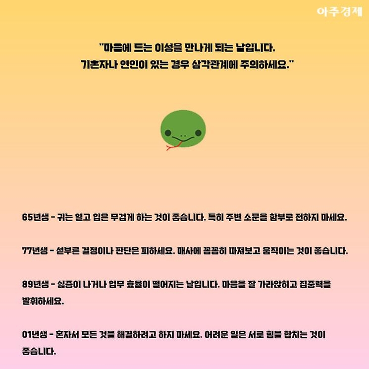 ▶뱀띠 오늘의 운세 "마음에 드는 이성을 만나게 되는 날입니다. 기혼자나 연인이 있는 경우 삼각관계에 주의하세요."