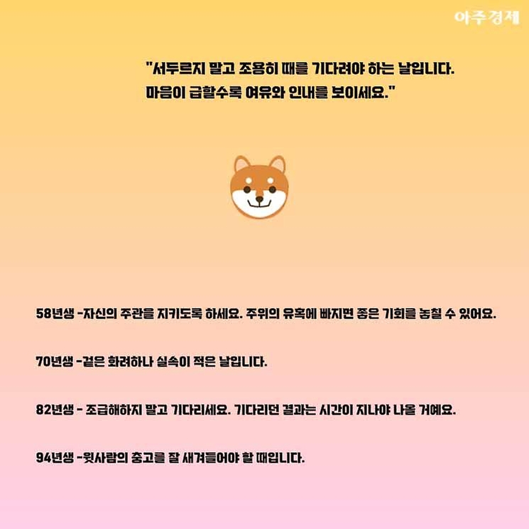 ▶개띠 오늘의 운세 "서두르지 말고 조용히 때를 기다려야 하는 날입니다. 마음이 급할수록 여유와 인내를 보이세요."