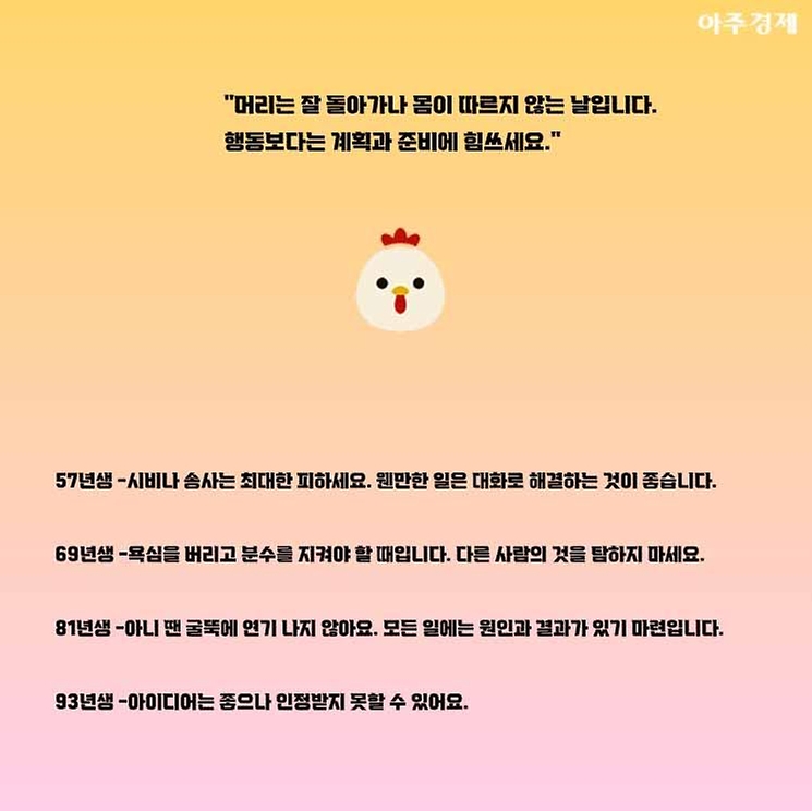 ▶닭띠 오늘의 운세 "머리는 잘 돌아가나 몸이 따르지 않는 날입니다. 행동보다는 계획과 준비에 힘쓰세요."