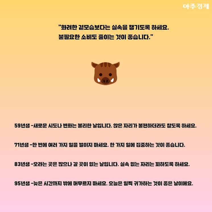 ▶돼지띠 오늘의 운세 "화려한 겉모습보다는 실속을 챙기도록 하세요. 불필요한 소비도 줄이는 것이 좋습니다. "