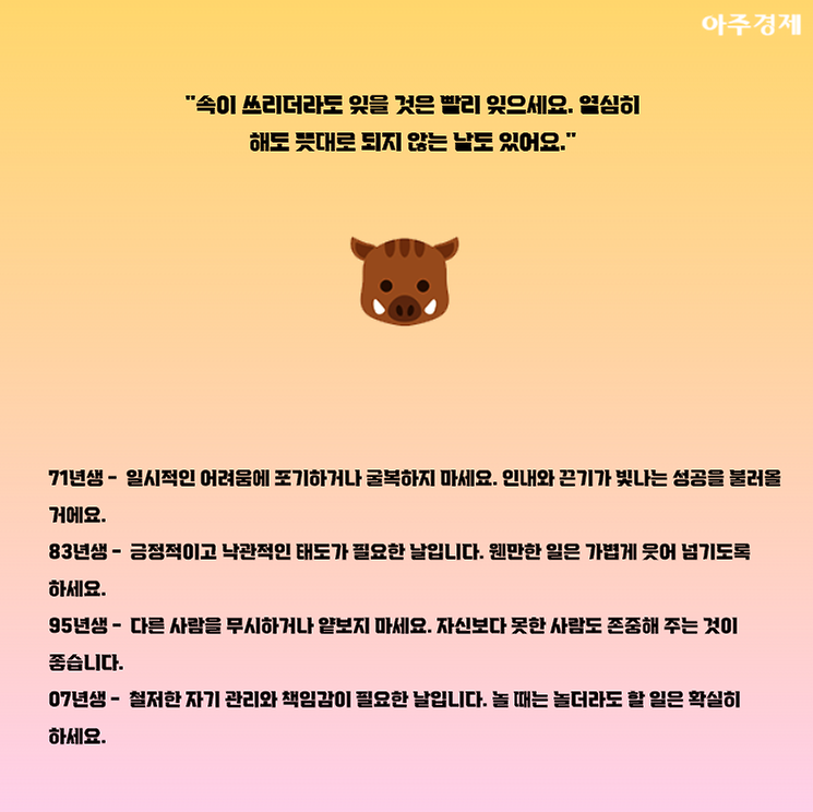 ▶돼지띠 오늘의 운세 "속이 쓰리더라도 잊을 것은 빨리 잊으세요. 열심히 해도 뜻대로 되지 않는 날도 있어요."