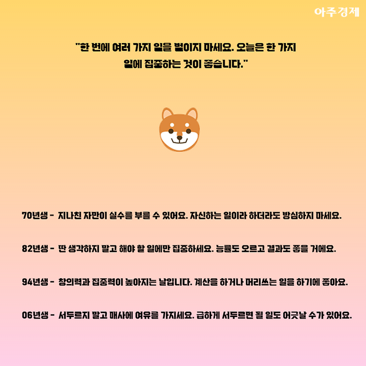 ▶개띠 오늘의 운세 "한 번에 여러 가지 일을 벌이지 마세요. 오늘은 한 가지 일에 집중하는 것이 좋습니다."