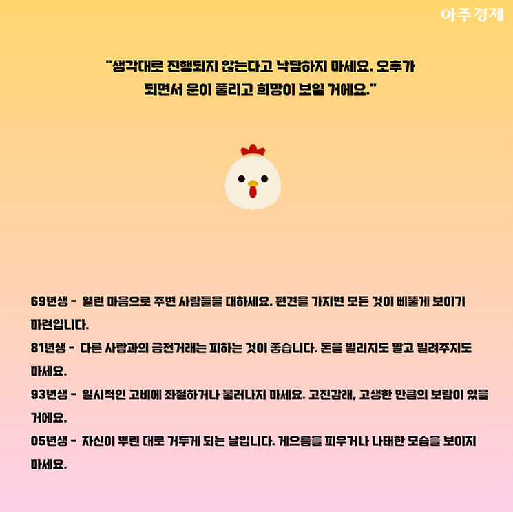 ▶닭띠 오늘의 운세 "생각대로 진행되지 않는다고 낙담하지 마세요. 오후가 되면서 운이 풀리고 희망이 보일 거에요."
