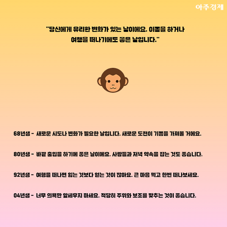 ▶원숭이띠 오늘의 운세 "당신에게 유리한 변화가 있는 날이에요. 이동을 하거나 여행을 떠나기에도 좋은 날입니다."