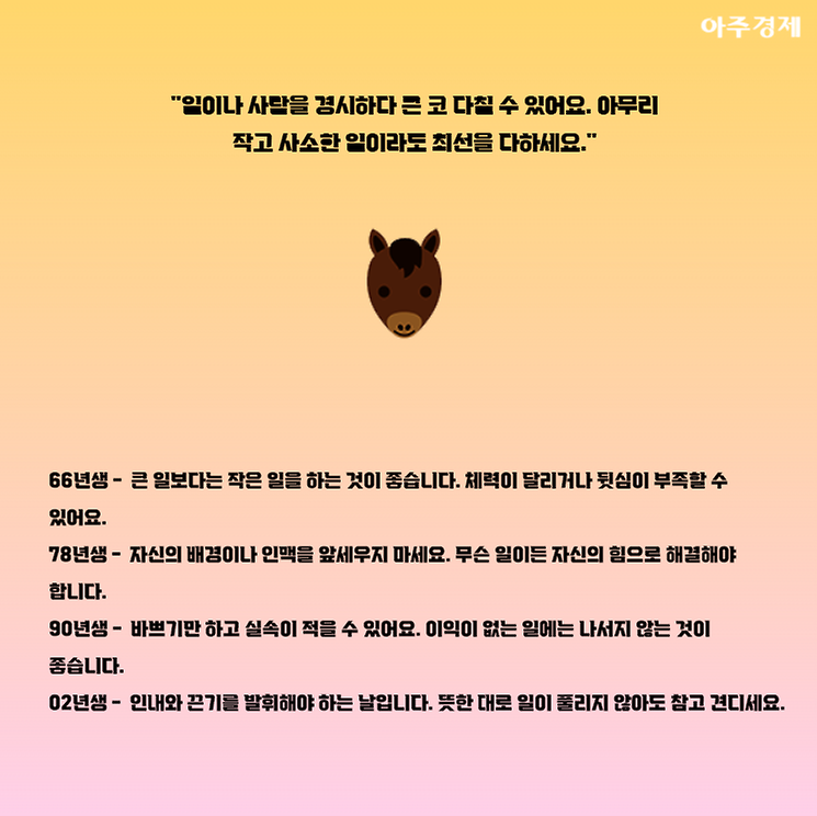 ▶말띠 오늘의 운세 "일이나 사람을 경시하다 큰 코 다칠 수 있어요. 아무리 작고 사소한 일이라도 최선을 다하세요."