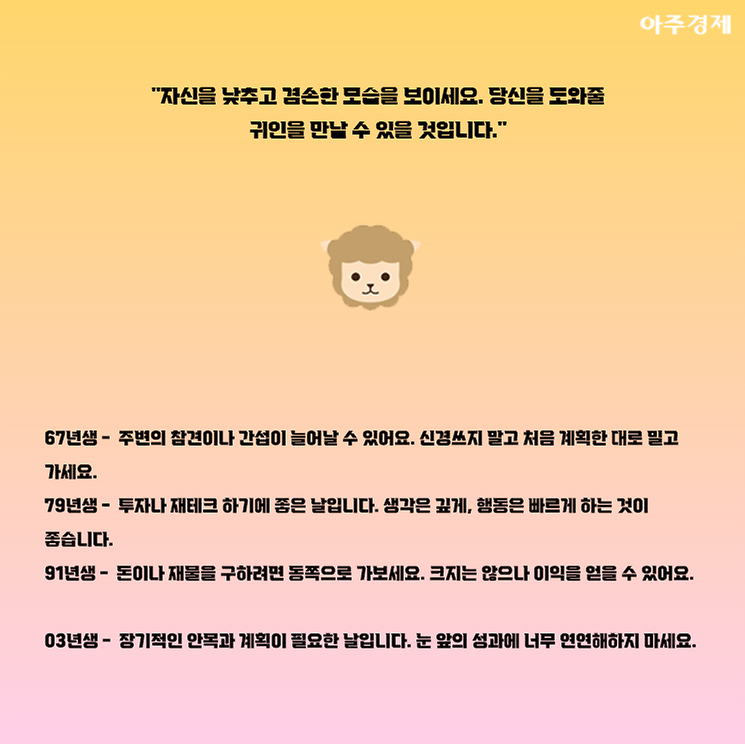 ▶양띠 오늘의 운세 "자신을 낮추고 겸손한 모습을 보이세요. 당신을 도와줄 귀인을 만날 수 있을 것입니다."