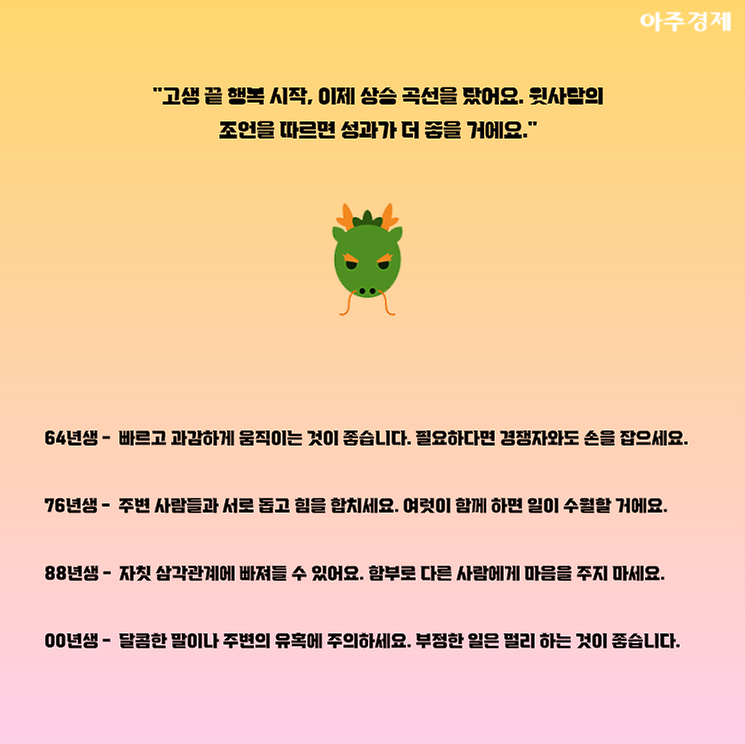▶용띠 오늘의 운세 "고생 끝 행복 시작, 이제 상승 곡선을 탔어요. 윗사람의 조언을 따르면 성과가 더 좋을 거에요."