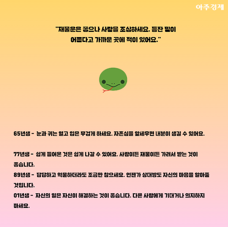 ▶뱀띠 오늘의 운세 "재물운은 좋으나 사람을 조심하세요. 등잔 밑이 어둡다고 가까운 곳에 적이 있어요."
