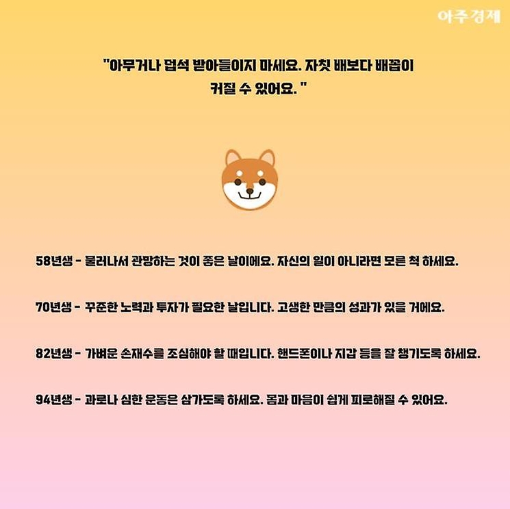 ▶개띠 오늘의 운세 "아무거나 덥석 받아들이지 마세요. 자칫 배보다 배꼽이 커질 수 있어요."