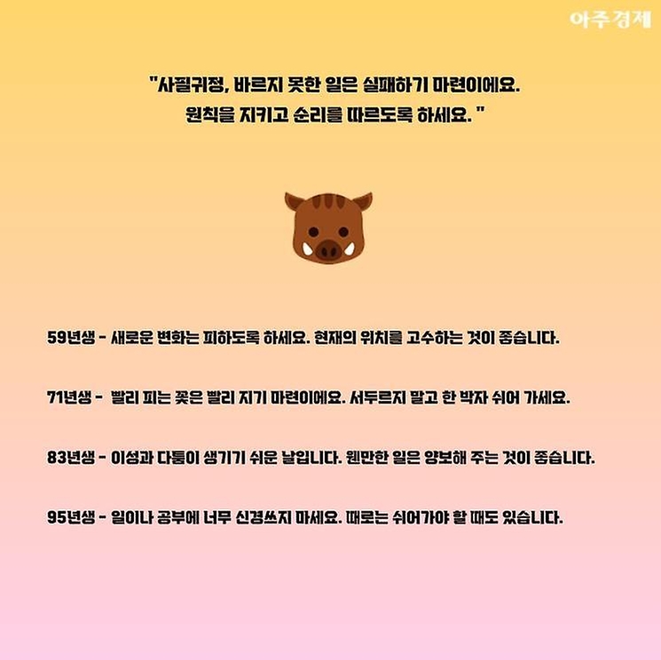 ▶돼지띠 오늘의 운세 "매사에 원칙을 지키고 순리를 따라야 하는 날입니다. 안 되는 일에 매달리거나 미련을 갖지 마세요."