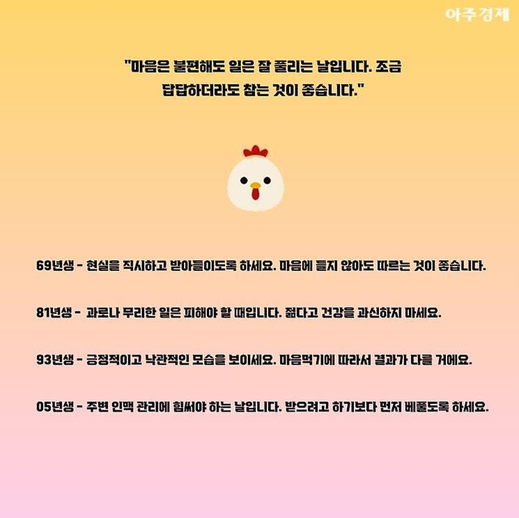 ▶닭띠 오늘의 운세 "마음은 불편해도 일은 잘 풀리는 날입니다. 조금 답답하더라도 참는 것이 좋습니다."