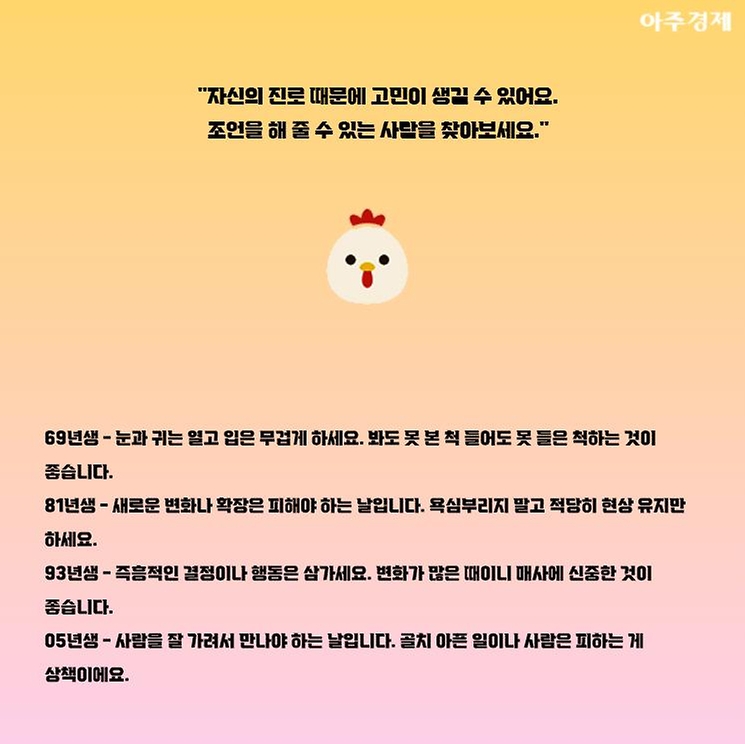 ▶닭띠 오늘의 운세 "자신의 진로 때문에 고민이 생길 수 있어요. 조언을 해 줄 수 있는 사람을 찾아보세요."