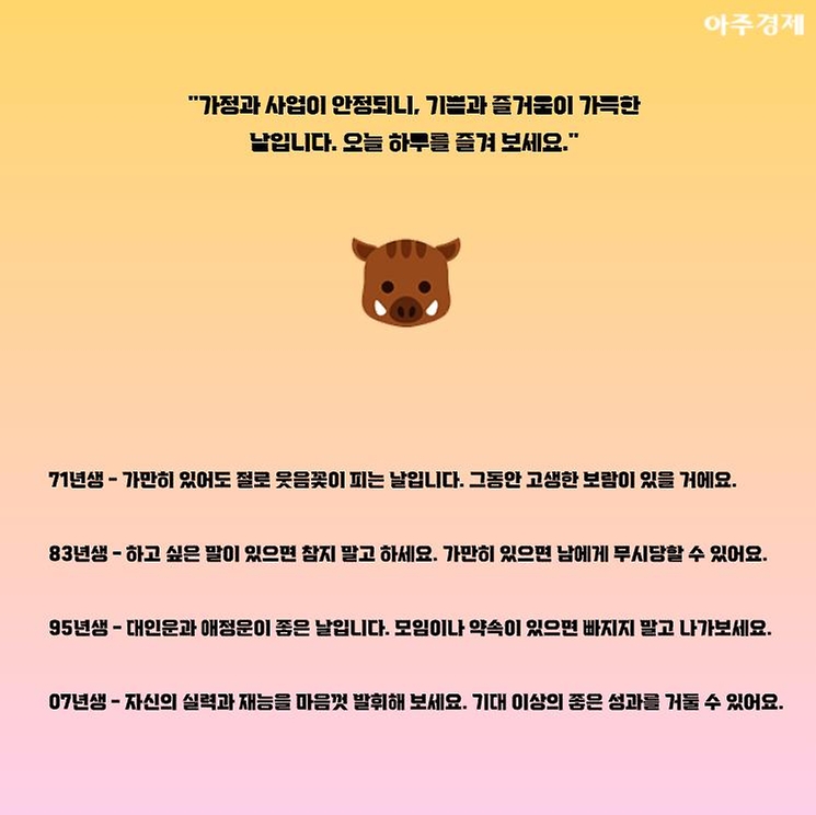 ▶돼지띠 오늘의 운세 "가정과 사업이 안정되니, 기쁨과 즐거움이 가득한 날입니다. 오늘 하루를 즐겨 보세요."
