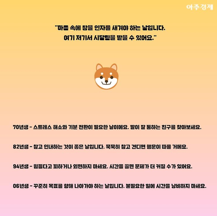 ▶개띠 오늘의 운세 "마음 속에 참을 인자를 새겨야 하는 날입니다. 여기 저기서 시달림을 받을 수 있어요."